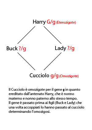 Both parents, Buck and Lady, may have received the same g gene from Harry, who is heterozygous for G/g. The puppy can therefore be homozygous for the gene (g/g) due to the parents’ common ancestor, Harry, with a certain probability.