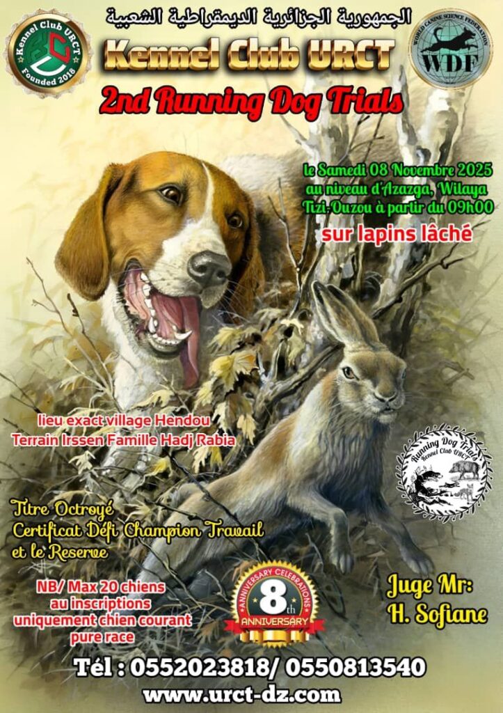 – After a four-year absence from hunting dog competitions, the Kennel Club URCT is back with the second Running Dog Trials on a Rabbit Run 🐰🐇 competition, scheduled for Saturday, November 8th. It will take place in the commune of Azazga, in the Hendou village, on the farmland of the Hadj Rabia dis Irssen family. This competition is open to purebred dogs only and covers 72 distinct breeds of hounds.